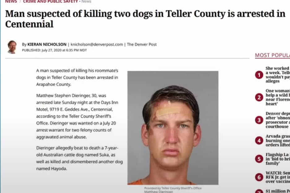 Dieringer was no stranger to legislation enforcement. In 2020, Arapahoe County deputies in Colorado arrested him after he was accused of killing two of his roommate’s canines. One of many animals, a seven-year-old Australian cattle canine named Suka, was dismembered, whereas the opposite, a black canine named Hayoka, was additionally killed. The disturbing case led to years of delays as a result of psychological well being competency hearings, however in 2023, Dieringer was convicted of felony animal cruelty and sentenced to 18 months in jail.
